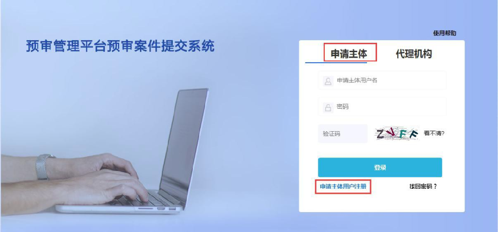 申请主体在登录页面点击使用帮助可以查看预审案件提交系统简要使用说明,方便用户更好的使用本系统。