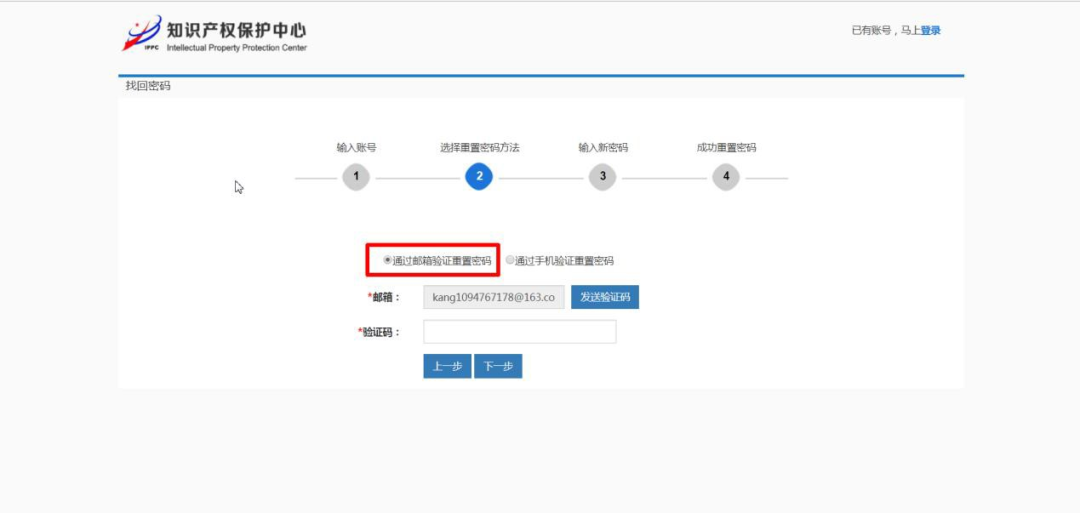 点击下一步,选择重置密码方式。以选择邮箱验证重置密码为例,选择短信验证重置密码与之类似,不再赘述。选择通过邮箱验证重置密码,输入注册时填写的联系人邮箱,点击发送验证码,如下图所示: