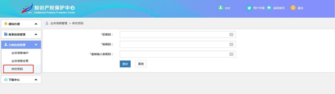 申请主体点击企业信息管理里面的“修改密码”链接,进入密码修改界面,如下图所示: