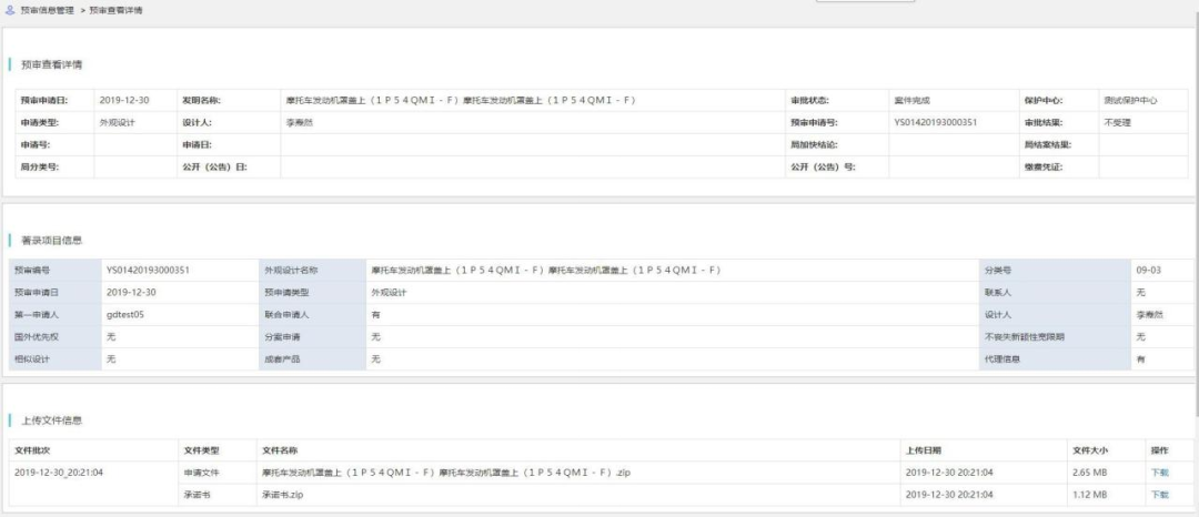 申请主体用来查看审核通过、不通过、不受理的专利申请预审案件。