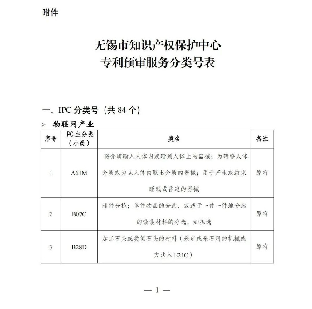 经国家知识产权局核定,无锡市知识产权保护中心专利预审服务分类号新增5个国际专利分类(IPC)(见附件)。